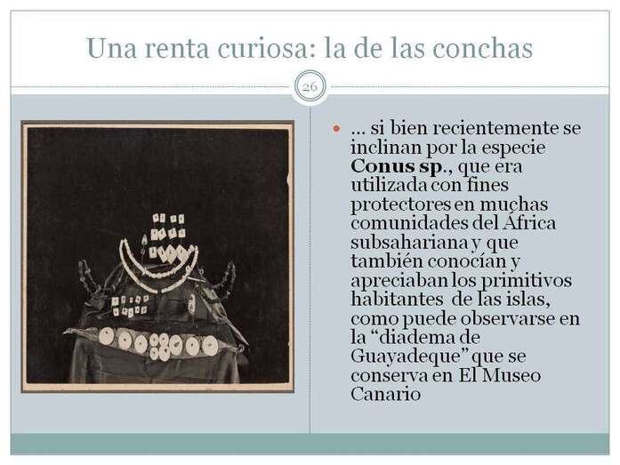 Una renta curiosa era la procedente de las conchas. Las conchas, las conchitas que vemos en la playa y que para los niños es un auténtico tesoro, también fue un tesoro en épocas pretéritas. Concretamente una concha, la historiografía va hablando de concha distintas, pero los especialistas ahora se refieren a la Conus sp, sp es sin especificar. Esta Conus, si vemos en la foto del Museo Canario sería la que está abajo del todo, en el cinturón de abajo que representa la famosa diadema de Guayadeque. Estas conchas tenían un valor tal que se llevaban a trocar a la costa africana, se introducían por el Golfo de Guinea y se cambiaban por oro y por esclavos, de tal forma que las conchas valían una auténtica fortuna, pues en aquella época una simple concha costaba a lo mejor el equivalente a un esclavo, estamos hablando de un valor muy alto. Como era un valor alto y las conchas estaban en el suelo era un regalía, y las regalías pertenecían a la Corona, de tal forma que la Corona le dio esta renta a un militar, y este militar a su vez se la arrendó a uno de Gran Canaria, a uno de Tenerife y a otro de La Palma, y venían los barcos y tenían que negociar con quién tenía la renta de las conchas para llevarse la Conus al Golfo de Guinea.