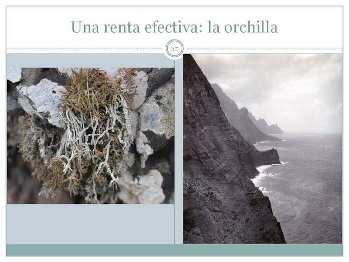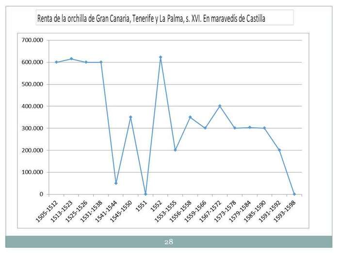 Y una renta efectiva la de la orchilla.  El liquen de la orchilla que crece en toda la costa de los acantilados abruptos de La Aldea, hasta bien entrado el siglo XIX, incluso en las primeras décadas del siglo XX se recogía este liquen. Este liquen servía para lograr el color purpura, casi sagrado, que era famosísimo, no solo en estos siglos nuestros, sino antes, de tal forma que los fenicios y los romanos recolectaban la orchilla para hacer el color purpura. Uno de los orígenes que se creen de Canarias es precisamente el que trajesen a población de África a las islas para que cultivasen la orchilla. Y al cabo de un año o dos años, venían fenicios,  romanos, y trocaban esa orchilla por alimentos, y era una industria efectiva. La orchilla se recaudó de una forma importante en las islas de Realengo, también en la costa africana y con una recaudación de 600.000 maravedíes de la época, y hay años en que no se recauda nada, porque se agotaba la orchilla y había que esperar a que se regenerase.