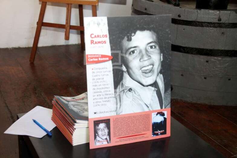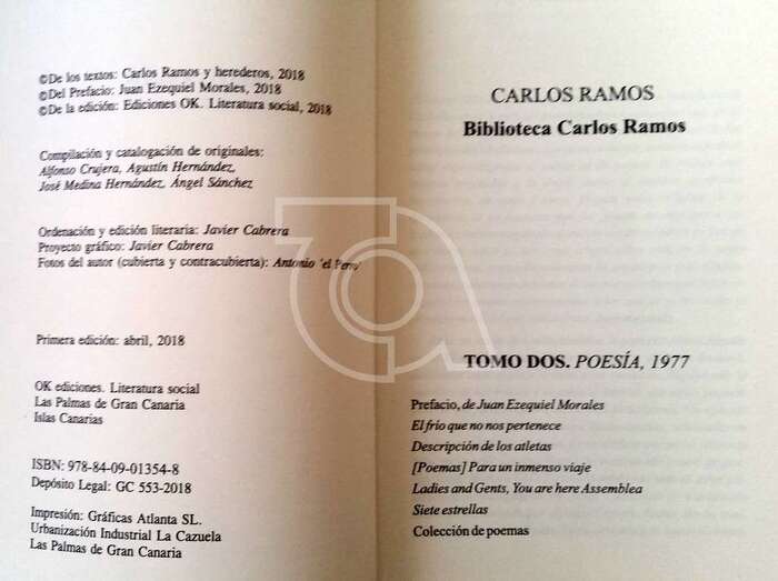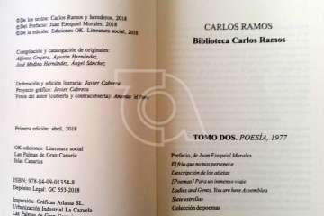 Tras su fallecimiento, decidí recopilar su obra que estaba dispersa en manos de sus amigos, ya que siempre nos dejaba copias de sus poemas a unos y a otros. A pesar del dolor de la pérdida tomé esa decisión, consideré que, si pasaba el tiempo, nos olvidaríamos, no de Carlos, pero sí de dónde guardamos aquellos poemas suyos y al final acabarían por perderse. Con la ayuda de su amigo común, Pepe Medina, pedimos prestados y fotocopiamos poemas y textos, pasamos a máquina todo aquel material y formamos un corpus de casi 400 poemas que aún conservamos. Agradezco a todos sus amigos que nos facilitaron copias e hicieron posible que la obra de Carlos Ramos esté hoy reunida. Suponemos que puede haber más, porque cuando presentamos el primer tomo, apareció un texto que yo echaba de menos que era El hombre que mató al Presidente, y una de las copias apareció en Fuerteventura, está aquí de nuevo y hoy nos congratulamos de tener ese texto que yo recordaba pero no lo teníamos.