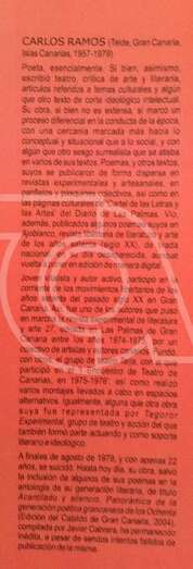 Seguimos asombrándonos de la calidad poética de Carlos Ramos, en su amplia calidad plástica y lírica tomando forma y contenido en el libro un tanto sorprendente de un joven escritor que en el año 1977 contaba con apenas veinte años. Un libro realmente importante en la poesía canaria contemporánea, su actualidad al día en su obra que parece recién escrita y la poesía no se ha puesto vieja, el discurso sigue siendo constante y la potencia aumenta a medida que vamos leyendo su obra, con la esperanza de que en los próximos libros se vayan ratificando esas composturas que vamos teniendo a lo largo de la revisión de su material y textos”.