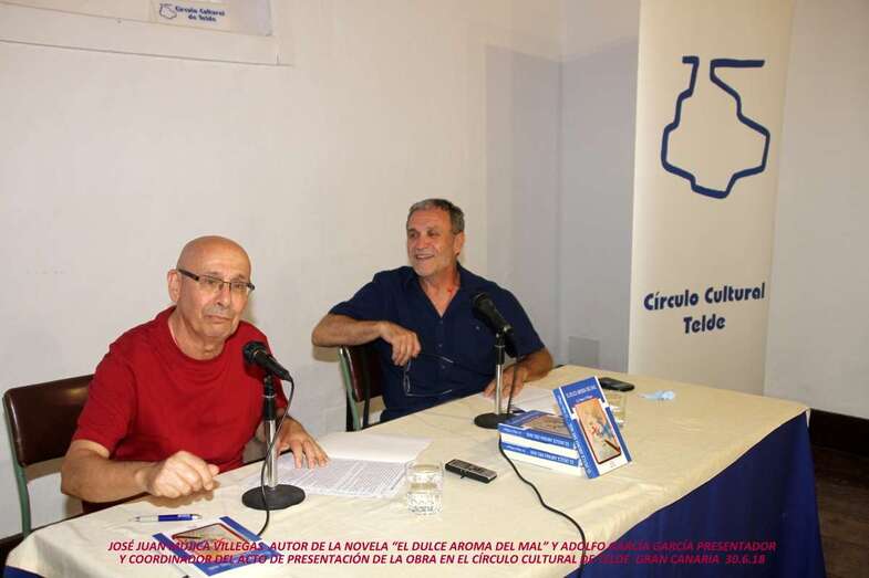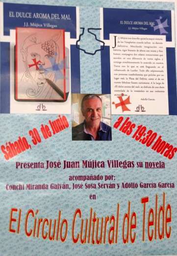 El sábado 30 de junio en el Círculo Cultural de Telde fue presentada la novela, El Dulce Aroma del Mal, reciente trabajo literario del escritor y poeta grancanario, José Juan Mújica Villegas, que después del éxito obtenido y extraordinaria aceptación que tuvo la obra en su primera presentación en el Círculo Mercantil de Las Palmas de Gran Canaria, el pasado martes 22 de mayo, con una representación dramatizada de la obra realizada por la Escuela Libre de Teatro del Café D’ Espacio de Las Palmas, basada en las reflexiones de los espacios textuales y temporales que, a través de los 25 capítulos a lo largo de 330 páginas, se desarrolla el contenido de la obra, dándose escenificación con personajes que en cuerpo y alma establecieron el nexo del mensaje humano de la obra encarnando a los protagonistas de esta interesante y curiosa historia.