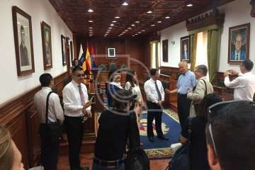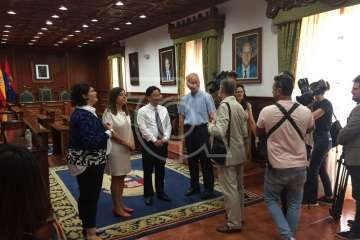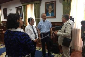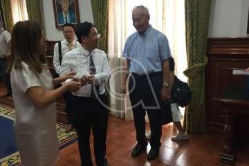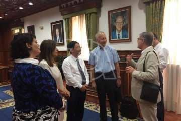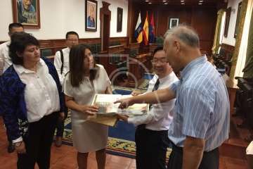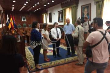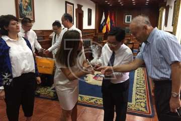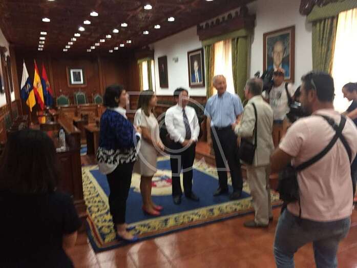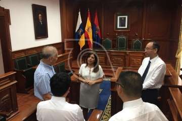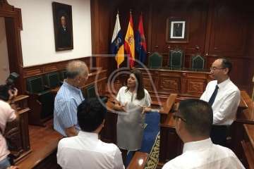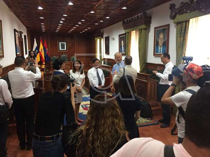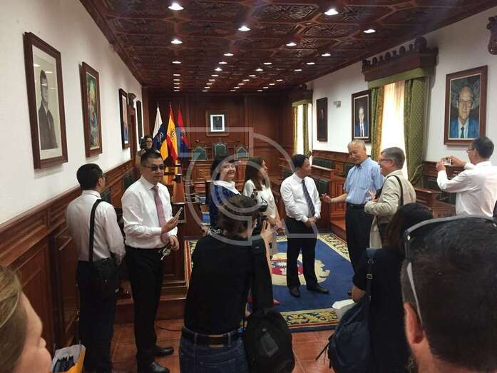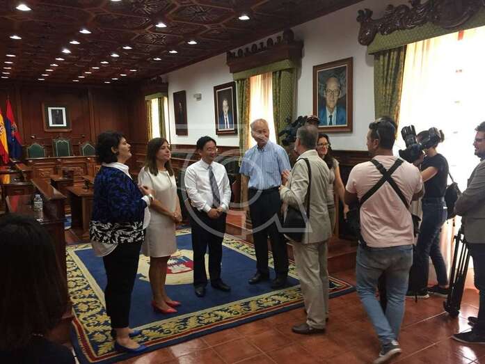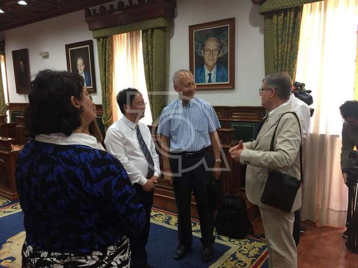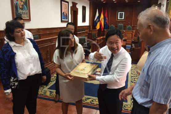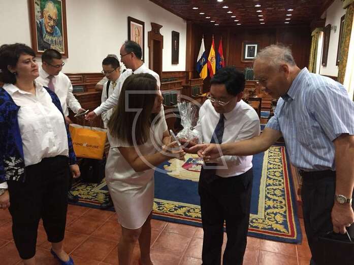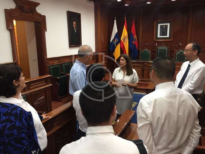 Esta mañana la delegación china fue recibida en la sala capitular de las Casas Consistoriales de San Juan por la alcaldesa Carmen Hernández y la concejala de Turismo, Celeste López, oficiando de guía Antonio María González, cronista oficial de Telde, quien con la ayuda de un traductor les explicó de forma somera los aspectos históricos más relevantes del municipio, por los que los visitantes mostraron un gran interés.