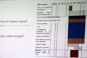 Hay que presentar un planing realizado por esta Sociedad y la Fundación Universitaria es la que va a certificar que este trabajo se hace científicamente y con una dirección o varias en su corrección, aunque partimos de la base que soy investigadora novel, pero el tiempo que nos dan es el de diez meses que nos da la Fundación, hemos consumido parte de ese tiempo y de momento estoy trabajando sobre las Actas.