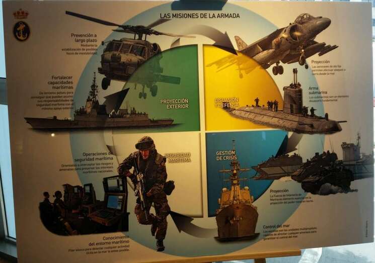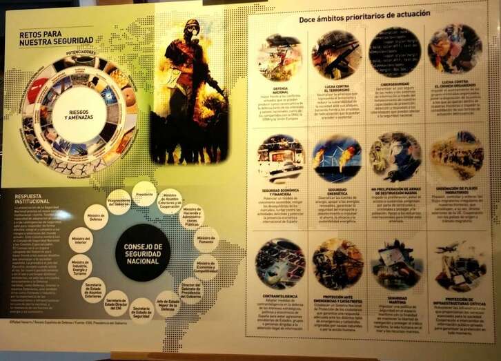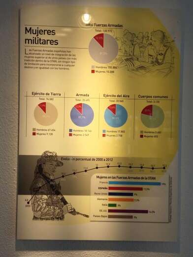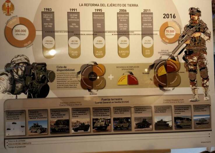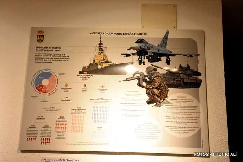 Divida en seis bloques –estructura orgánica de las Fuerzas Armadas (FAS), Ejército de Tierra, Ejército del Aire, Armada, UME y mujeres militares– muestra la evolución de las FAS desde la década de los 80 a la actualidad, poniendo especial énfasis en la vertiente humanitaria y en la la presencia internacional de España, con más de 2.500 efectivos desplegados en quince misiones en el exterior. También destaca la presencia femenina, con una media de un 12,5 %, superior a la de la mayoría de los países miembros de la OTAN.