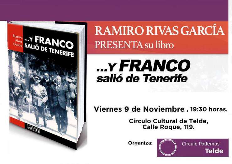 Telde.- El historiador Ramiro Rivas presentó esta tarde-noche en Telde su libro Y Franco salió de Tenerife. El acto tuvo lugar en la sede del Círculo Cultural, organizado por la formación política Podemos.