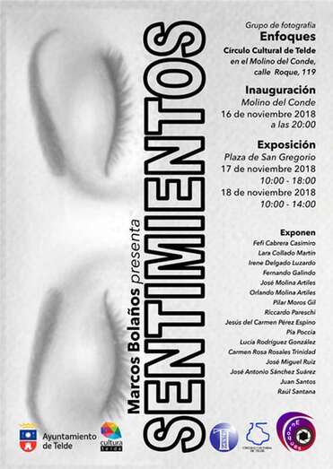 El grupo de fotografía Enfoques inauguró la noche del viernes 16 de noviembre en el Molino del Conde, sede del Círculo Cultural de Telde, la exposición colectiva fotográfica Sentimientos, muestra que participó en la mañana del sábado 17 dentro de los actos culturales con motivo de las fiestas de San Gregorio Taumaturgo, en la Plaza de los Llanos, actividad que se unió a otras del programa festivo que esta mañana se celebraban en este núcleo del barrio de San Gregorio, dando a conocer al público asistente esta colección de bellas imágenes fruto del trabajo artístico de este colectivo teldense Enfoques.