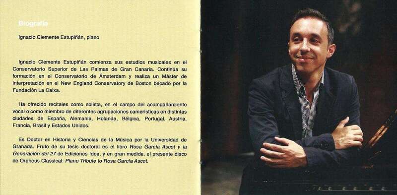 A su vez y extraordinario como siempre, y en este caso como resultado del riguroso estudio y proceso de investigación de la compositora García Ascot y su acontecer vital en el transcurso del siglo XX, el pianista de Telde, Ignacio Clemente Estupiñán, conocedor del trabajo musical y de relación personal en la sociedad intelectual del Madrid y la España anterior a la Guerra Civil, fruto del excelente trabajo que llevó a cabo en la edición de su libro Rosa García Ascot y la Generación del 27, de Ediciones Idea, cuyo contenido literario, histórico y musical, fue premiado Cum Laude en la presentación de su Tesis de Doctorado en Historia y Ciencias de la Música por la Universidad de Granada.