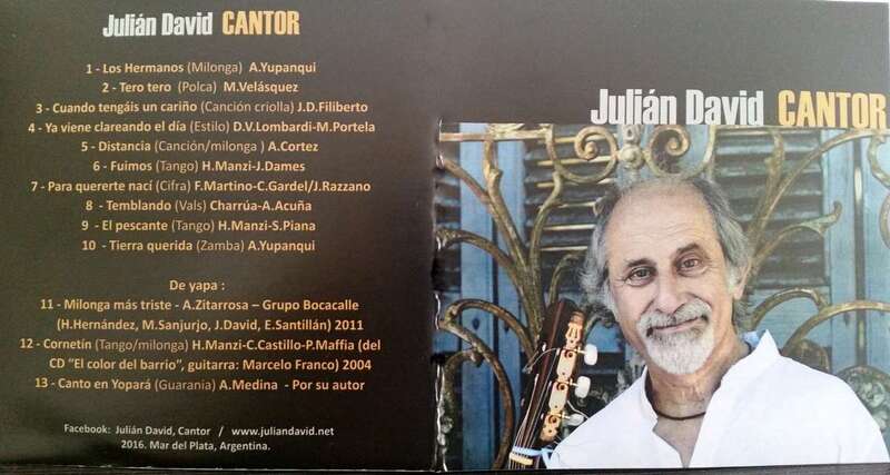 Julián David presenta en su concierto temas que incluye en uno de los trabajos discográficos, bellas letras del cancionero interpretado, canciones criollas y tangos, recopilación de este variado repertorio en sus trabajos discográficos, expresiva sonrisa de Cantor argentino, apoyado por el clavijero de su guitarra ante el balcón de su casa natal en Ayacucho, que la imagen de Martin de Alza capta en la portada del CD con temas como Los Hermanos (Milonga), Tero tero(Polca), Cuando tengáis un cariño (canción criolla), Ya viene clareando el día (estilo), Distancia (canción/milonga), Fuimos (tango), Para quererte nací (Cifra), Temblando (vals), El pescante (tango), Tierra querida (zamba), Milonga más triste. Cornetín (tango/milonga), El color del barrio, Canto en Yopará (guaranía).