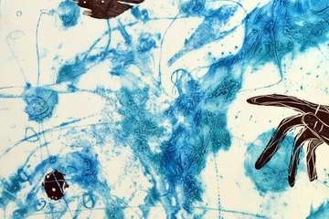 Las líneas hablan de las conexiones: unas nítidas, otras inciertas. Las formas caprichosas son las verdades, las ideas, las memorias… Chispas de entendimiento que son puntos, letras que representan el lenguaje que estructura las ideas. Lo invisible viene representado por elementos abstractos, texturas que tratan de ser alcanzadas a través de unas manos que representan ese otro mundo, el de lo visible. La técnica del collage, por su parte, sirve para representar la complejidad de los recuerdos, las memorias, las emociones tomando elementos de aquí, de allá y poniéndolos juntos, conformando la composición misma de la obra.