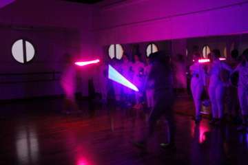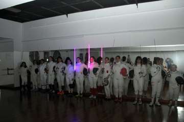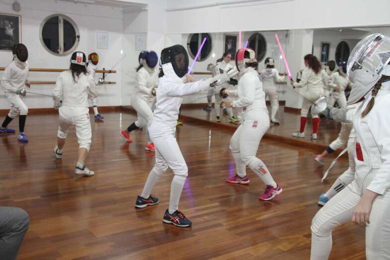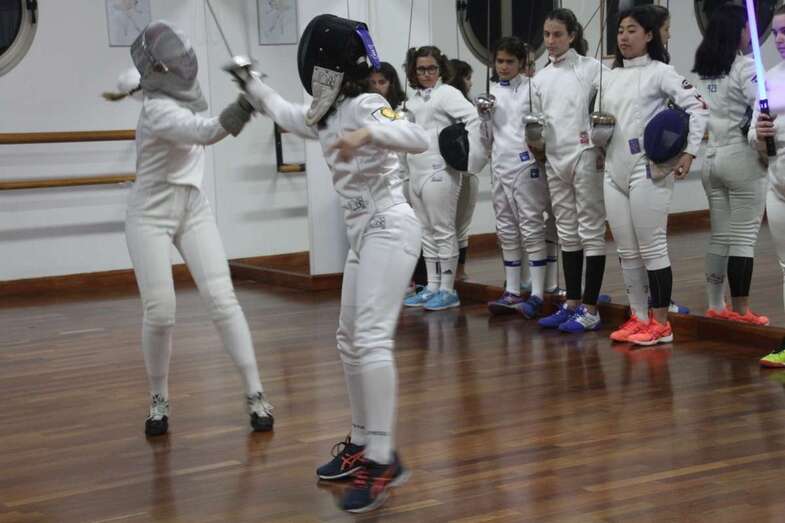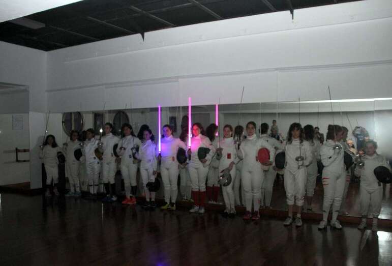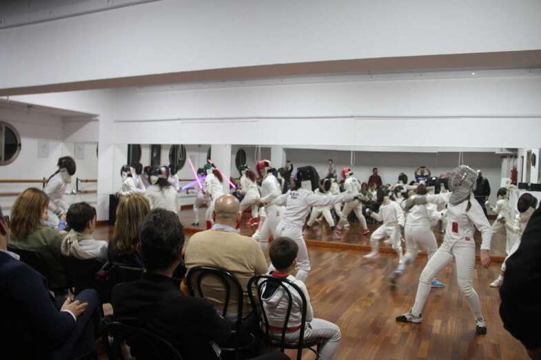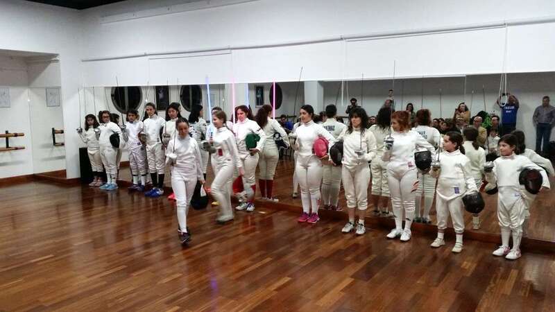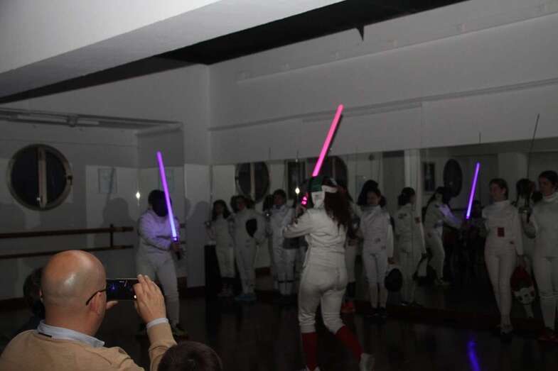 Hacen su entrada el grupo de deportistas de la esgrima bajo la banda sonora de la Guerra de las Galaxias, que la federación francesa y americana la presenta en competiciones hacia el futuro. En las diferentes modalidades comienza la exhibición y el grupo inicia sus movimientos en espada y sable con las primeras participantes y posteriormente el grupo al completo en este escenario de la sala de danza y música del Teatro Juan Ramón Jiménez, demostrando por la concentración de los diversos movimientos la relación mente cuerpo que como exponen los entrenadores la esgrima es un deporte de línea abierta, por no ser repetitivo, movimientos completamente cambiantes y adaptables en sus variantes a la técnica del contrario, haciéndose necesario crear estrategias de combate, física y neurológicamente, se van creando conexiones nuevas neuronales importante de cara al estudio y conductas beneficiosas para el rendimiento cerebral, gran ventaja de la esgrima y su adaptación en el desarrollo físico y neurológico.