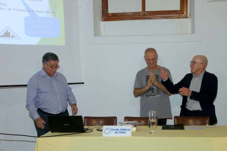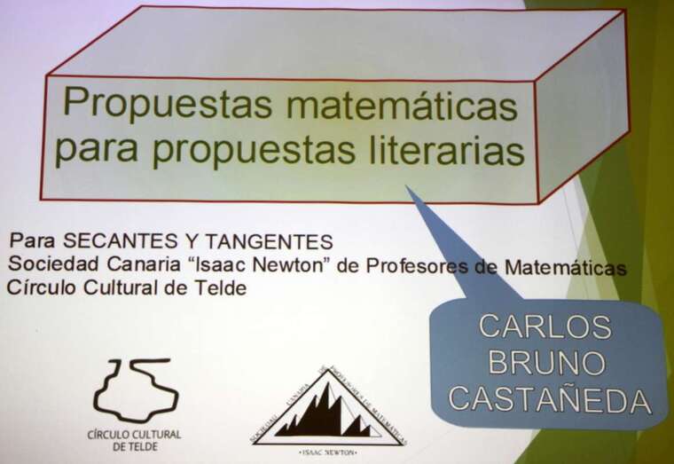 En su intervención el profesor Carlos Bruno Castañeda agradece las intervenciones previas, y al Círculo Cultural de Telde por acoger la Asociación, expone con la proyección de imágenes la ponencia basada en el título del ciclo Secante y Tangentes porque tiene que ver la literatura con las matemáticas en sus puntos de conjunción y en sus diversos ciclos se han impartido conferencias por ponentes con o sin conocimiento o perspectiva de las matemáticas.
