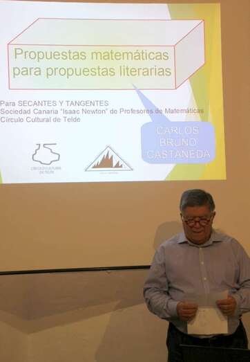 Con este fin se impartió en el Círculo Cultural de Telde en su sede del Molino del Conde, calle El Roque 119 de Telde, el jueves 21 de marzo, la ponencia “Propuestas Matemáticas para Propuestas Literarias para Secantes y Tangentes”, impartida por el licenciado en Matemáticas profesor D. Carlos Bruno Castañeda, organizada por la Sociedad Canaria de Profesores de Matemáticas “Isaac Newton”, representada en Telde y en este acto por el vocal de la directiva y de la sede de esta institución en Gran Canaria, Arístides Ramírez Martel.
