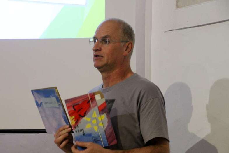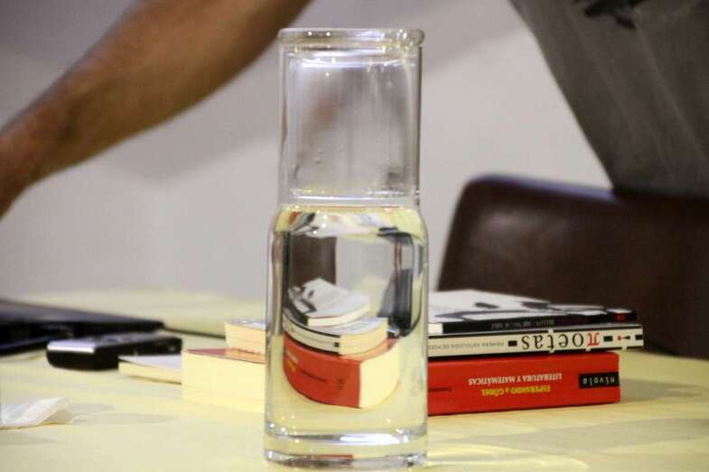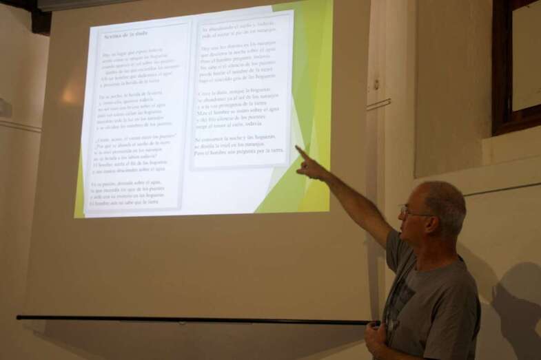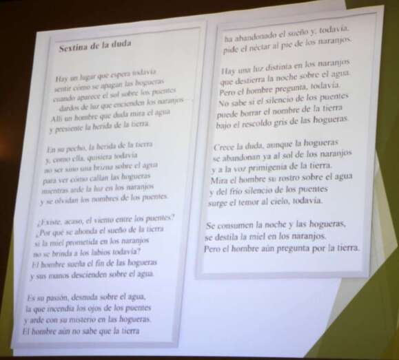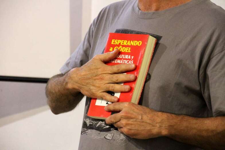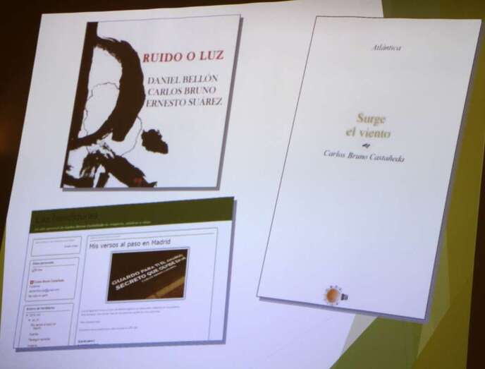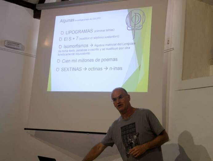 Interviene Arístides Ramírez: “Para mí es una satisfacción presentar esta ponencia que impartirá Carlos Bruno a quien conozco hace mucho tiempo, nacido en Tenerife y muy vinculado a Gran Canaria, y sobre todo a través de la Sociedad Canaria de Profesores de Matemáticas Isaac Newton. Este fue un proyecto que se inició en Tenerife a través de la Casa-Museo de las Matemáticas Educativas a la isla de Gran Canaria con el título Ciclo de Literatura y Matemáticas Secantes y Tangentes. Carlos Bruño Castañeda (Santa Cruz de Tenerife, 1962), desde los ochenta está vinculado a iniciativas editoriales y literarias colectivas e independientes como “La calle de la Costa” o “La casa transparente”. Es fundador del único proyecto de edición de libros cartoneros en Canarias “Cartonera Island”.  Licenciado en Matemáticas por la Universidad de La Laguna y profesor de secundaria en esta área. En ámbitos docentes ha desarrollado talleres de creación literaria como “Taller Haikus” o “Poesía y Matemáticas”. Es autor de los poemarios “Sombras calladas de antes de llegar al mar” (Ed. La Calle de la Costa, 1989). “Surge el viento” (Col. Atlántica. Ed. Idea, 2006), “El viaje” (Ed. Cartonera Island, 2012), “Ruido o luz” (En coautoría junto a Ernesto Suárez y Daniel Bellón. Col. Once. Ed. Amargord, 2013), y ATL GA (Col. Sitio de fuego. Ed. Baile del Sol, 2018).