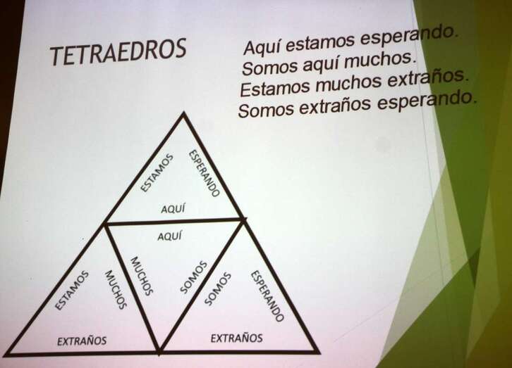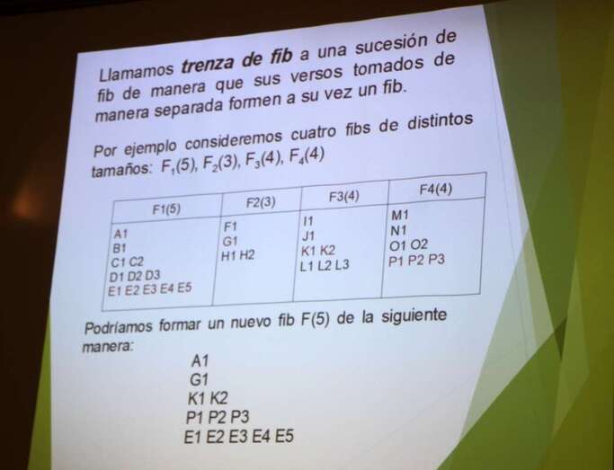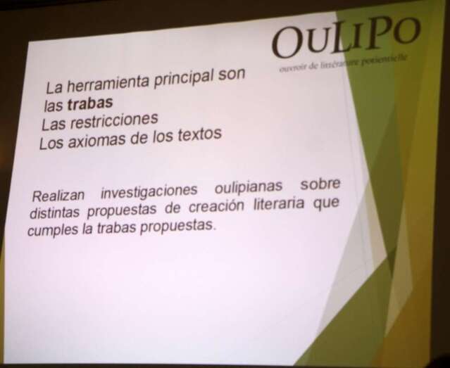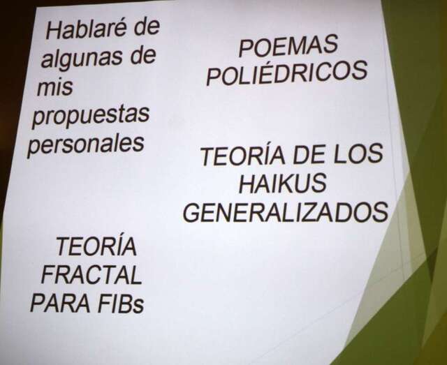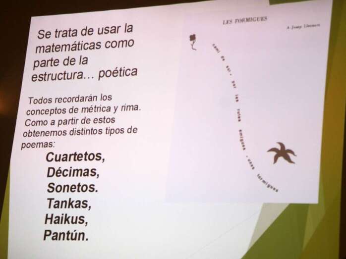 “Se puede hablar de la poesía que habla de las matemáticas como tema y de la poesía que usa de las matemáticas como ingrediente de la obra. Tratando de usar las matemáticas como parte de la estructura … poética. Recordando los conceptos de métrica y rima. Como a partir de estos Tankas, obtenemos distintos tipos de poemas: Cuartetos, décimas, sonetos, tankas, haikus, pantún, etc. Recordando al Grupo francés de escritores y matemáticos y su filosofía, crearon el grupo “Oulipo” (Ouvroir – Littérature – Potentielle [Obrador-Literatura-Potencial] en Francia en 1960). En las distintas propuestas de creación literaria, las investigaciones deben ser ingenuas, artesanales, divertidas y aplicando herramientas como las Trabas, las restricciones y axiomas de los textos.