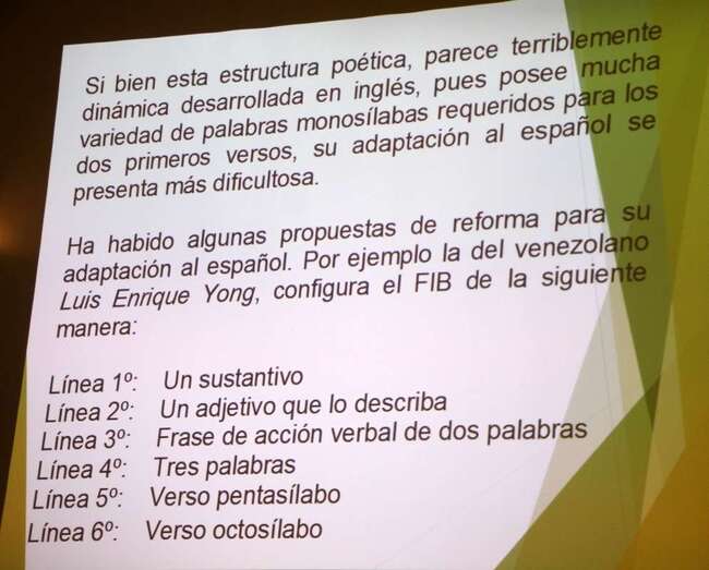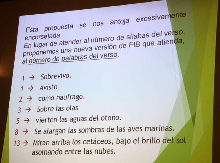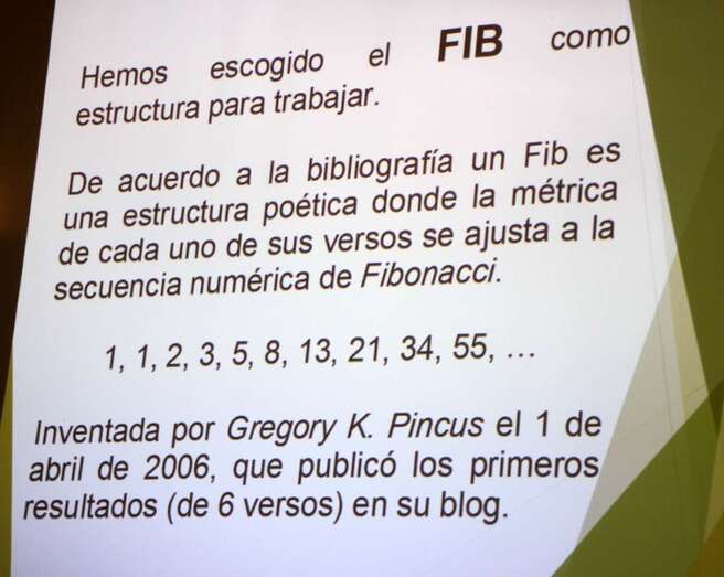 Incluyendo mis propuestas personales he abordado los poemas poliédricos, Teoría fractal para Fibs, teoría de los haikus generalizados. De acuerdo a la bibliografía un FIB es una estructura poética donde la métrica de cada uno de sus versos se ajusta a la secuencia numérica de Fibonacci. 1, 1, 2, 3, 5, 8, 13, 21, 34, 55, … Inventada por Gregory K. Pincus en 2006, que publicó los primeros resultados (de 6 versos) en su blog. Si bien esta estructura poética, parece terriblemente dinámica desarrollada en inglés, pues posee mucha variedad de palabras monosílabas requeridos para los dos primeros versos, su adaptación al español se presenta más dificultosa. Ha habido algunas propuestas de reforma para su adaptación al español. Por ejemplo, la del venezolano Luis Enrique Yong, configura el Fib de la siguiente manera <
