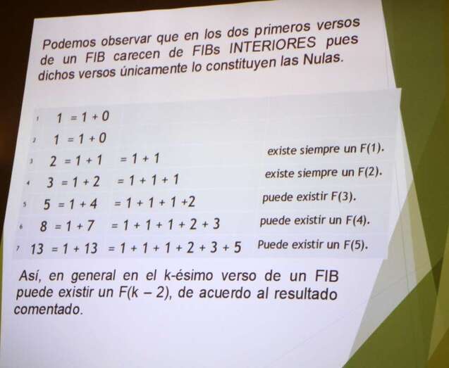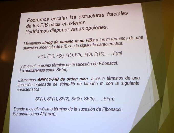 Con arreglo a cada una de las denominaciones nuevas para crear un verso y su relación con una sucesión numérica o lógica matemática, Bruno Castañeda muestra el concepto de fractal como objeto geométrico cuya estructura básica, fragmentada o aparentemente irregular, se repite a diferentes escalas, aplicando los resultados de la sucesión de Fibonacci, con la construcción de los fibs interiores y hacia el exterior con las opciones y combinaciones de m términos de la sucesión ordenada de Fib. Una aparente compleja fórmula de relacionar sucesiones y combinaciones de palabras según el verso y su lugar en el poema y las posibles relaciones numérica de la lógica matemática aplicada la construcción y esquema literario del poema.