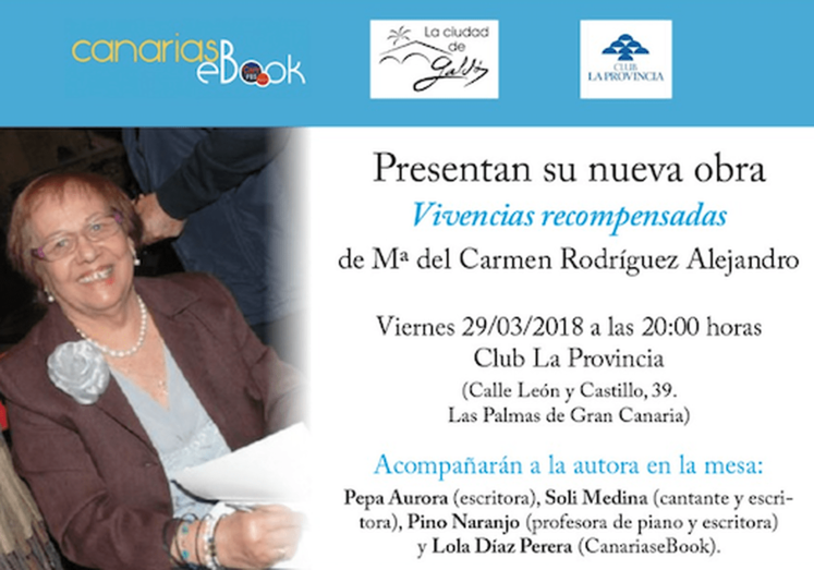 Telde.- La teldense María del Carmen Rodríguez Alejandro presenta su último libro, Vivencias recompensadas. Será este viernes, 29 de marzo, a partir de las 20.00 horas en el Club La Provincia (Calle León y Castillo, 39), en la capital grancanaria.