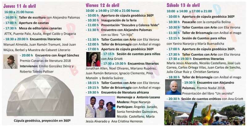 El viernes 12 las actividades se desarrollarán ente las 10.00 y las 14.00 horas, y las 17.00 y las 21.00 horas. La primera de ellas será la apertura de la cúpula geodésica 360º -proyecciones de diversa temática que por primera vez se realizan en Canarias-, justo antes de la inauguración oficial de esta cita con la literatura.