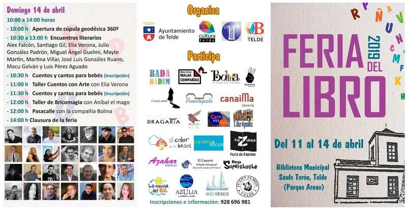 A las 11.00 horas, el cronista oficial de Telde, Antonio María González, presentará la publicación Descubre y Colorea Telde, una iniciativa con la que se pretende acercar a los más pequeños a algunos de los lugares y emblemas históricos de la ciudad. Seguidamente, Alejandro Palomas hablará con sus lectores sobre su libro Un hijo (11.30 horas); Elia Verona impartirá el taller Cuentos con Arte (11.30 horas) y Aníbal el Mago, el de Bricomagia (12.00 horas).