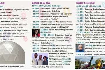El programa de actividades diseñado por la Concejalía de Cultura que dirige Marta Hernández (Nueva Canarias) y el servicio de Bibliotecas Municipales de la empresa pública Gestel comienza el jueves 11 de abril, a las 16.00 horas, con el taller de escritura que impartirá Alejandro Palomas, premio nacional de Literatura Infantil y Juvenil 2016, la apertura de las casetas y la mesa de las editoriales canarias que participan: ATTK Puente Palo, Azulia, Ángel Caído y Dragaria.
