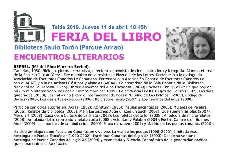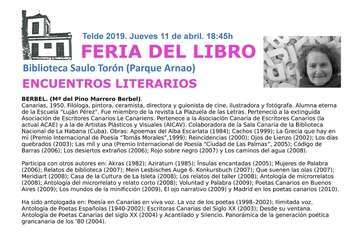El primero de los encuentros de los autores con sus lectores comenzará a las 18.30 horas con José Juan Mújica, que hablará sobre su último trabajo, Tejiendo en la pupila. Tras él, Berbel hablará de Irse (18.45 horas); Juan Ramón Tramunt, de Nunca más la noche (19.00 horas); y Manuel Almeida, de Manifiesto Ñ (19.15 horas). Este evento concluirá con Cabaret Literario, a cargo de Aparenta Ediciones y Cozidos (19.30 horas).
