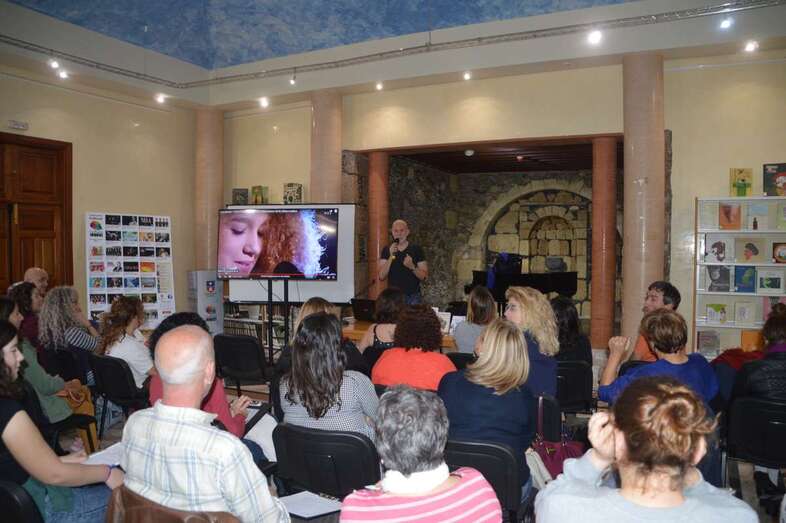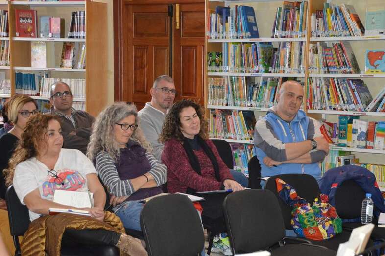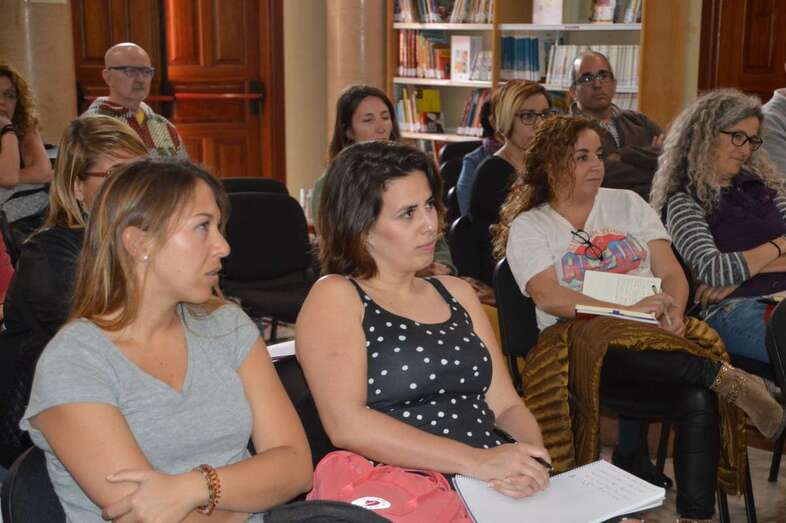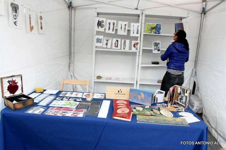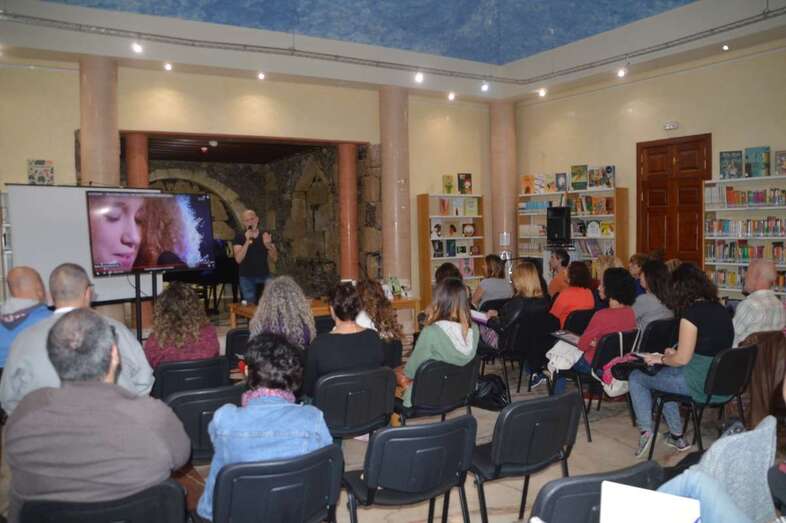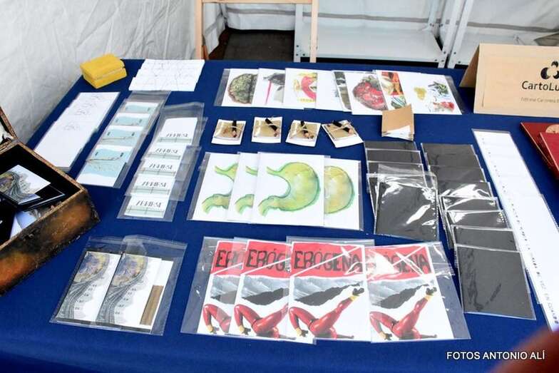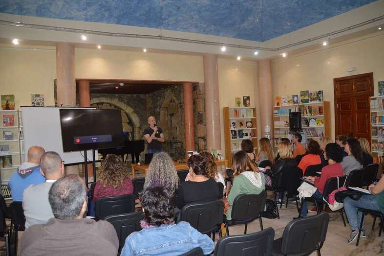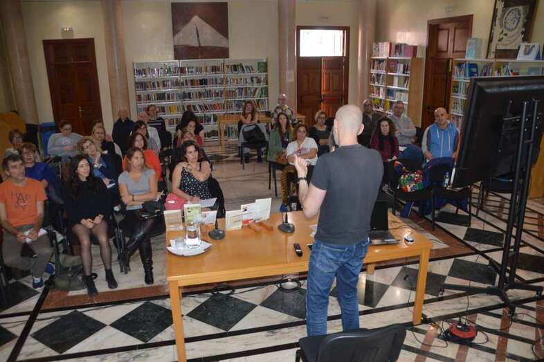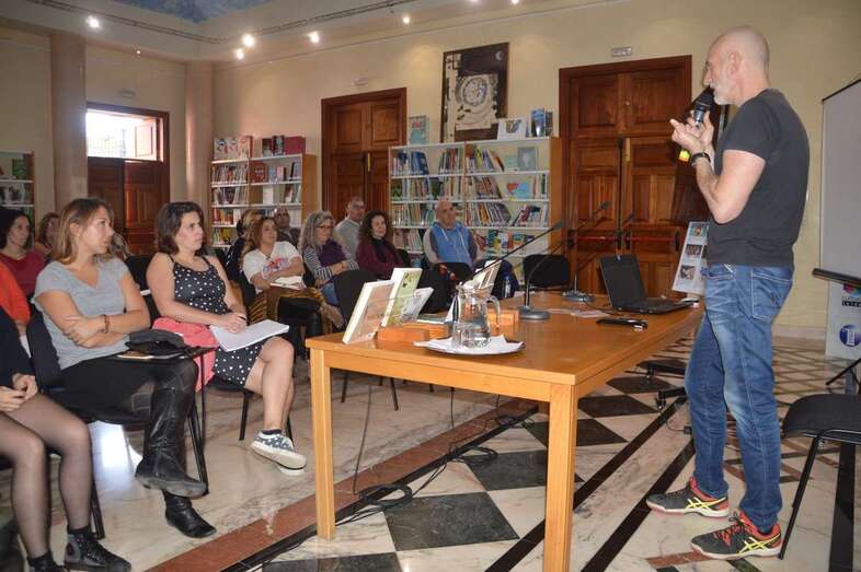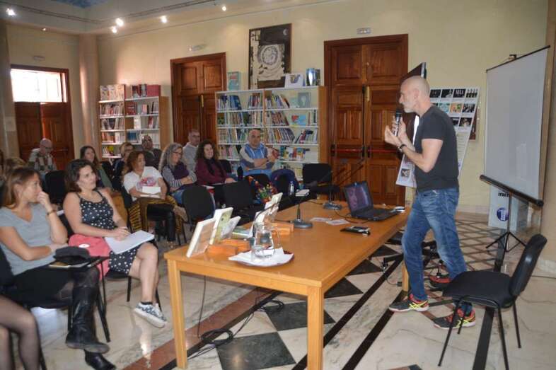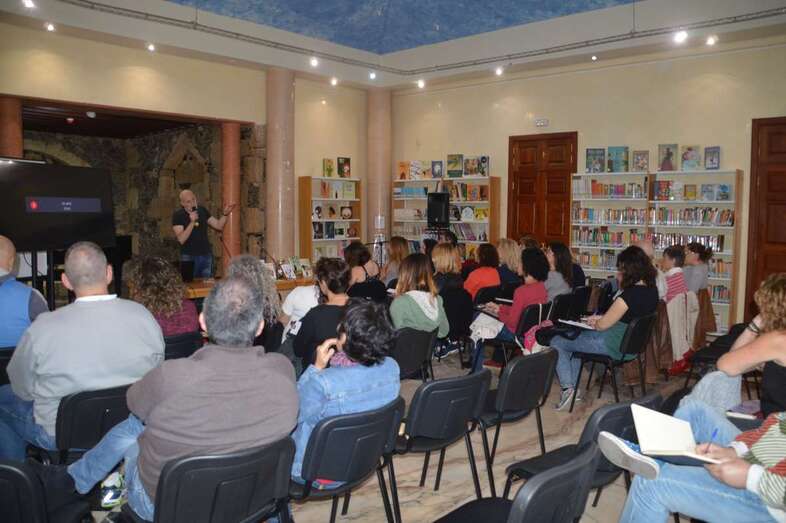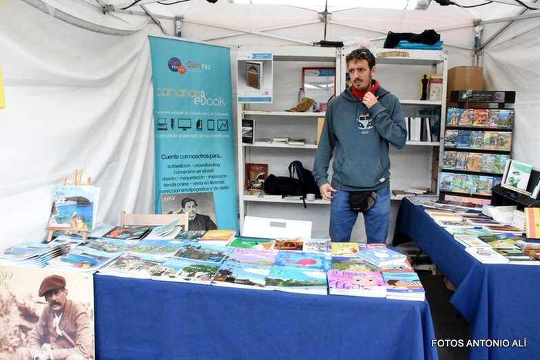A las 16.00 horas se desarrolló en la sala de la biblioteca la segunda última sesión del taller de escritura impartido por el escritor Alejandro Palomas, premio nacional de Literatura Infantil y Juvenil 2016 y Premio Nadal 2018, mientras en el exterior del recinto abrían al público las casetas y la mesa de las editoriales canarias que participan en esta muestra: ATTK Puente Palo, Azulia, Ángel Caído y Dragaria.