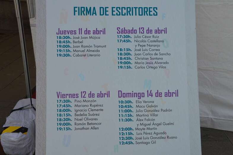 El primero de los encuentros de los autores con sus lectores comenzó a las 18.30 horas con José Juan Mújica, que habló sobre su último trabajo, Tejiendo en la pupila. Tras él, Berbel se refirió a Irse (18.45 horas); Juan Ramón Tramunt, a Nunca más la noche (19.00 horas); y Manuel Almeida, a Manifiesto Ñ (19.15 horas). Este evento concluyo con Cabaret Literario, a cargo de Aparenta Ediciones y Cozidos (19.30 horas).