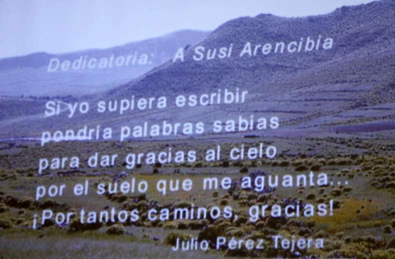 Finaliza el acto con las palabras finales de Inma Betancor y Julio Pérez que entregan a Montse, hija de Susi, un bello ramo de flores, el marco con el retrato de la misma que presidió el homenaje y el video con imágenes de sus numerosas presentaciones y desarrollo de las diferentes veladas. Como era costumbre al finalizar cada encuentro corresponde la foto de familia de todos los colaboradores e intervinientes en este homenaje, en el agradecimiento y recuerdo de la inolvidable Susi Arencibia. Mientras permanezcan en la mente y el corazón nunca se habrán ido. IN MEMORIAM. Versos de Julio Pérez Tejera que firma y cierra la imagen final del video proyectado: “Si yo supiera escribir/ pondría palabras sabias/ para dar gracias al cielo/ por el suelo que me aguanta…/ ¡Por tantos caminos, gracias!”.