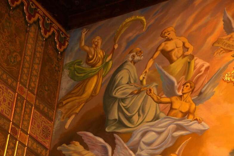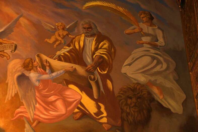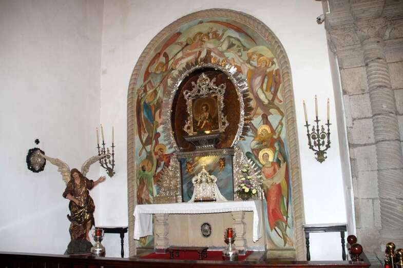 En esta última restauración en los años cincuenta intervino y es palpable la mano del pintor don José Arencibia. Trabajó durante año y medio en el mural del presbiterio, en la decoración de la capilla mayor, en el arco toral y otros elementos litúrgicos y decorativos de este templo. En esta tarde quisiera agradecer y poner en relevancia, ante todo, la obra de don José Arencibia, su acierto y su capacidad para crear un ámbito apropiado a la acción litúrgica. Acierto que podemos admirar cada vez que entramos en este espacio y nos sentimos envueltos en la atmósfera espiritual de su obra.