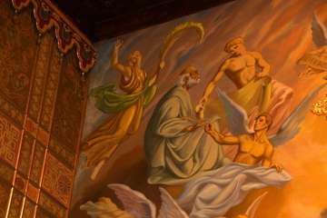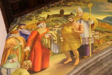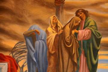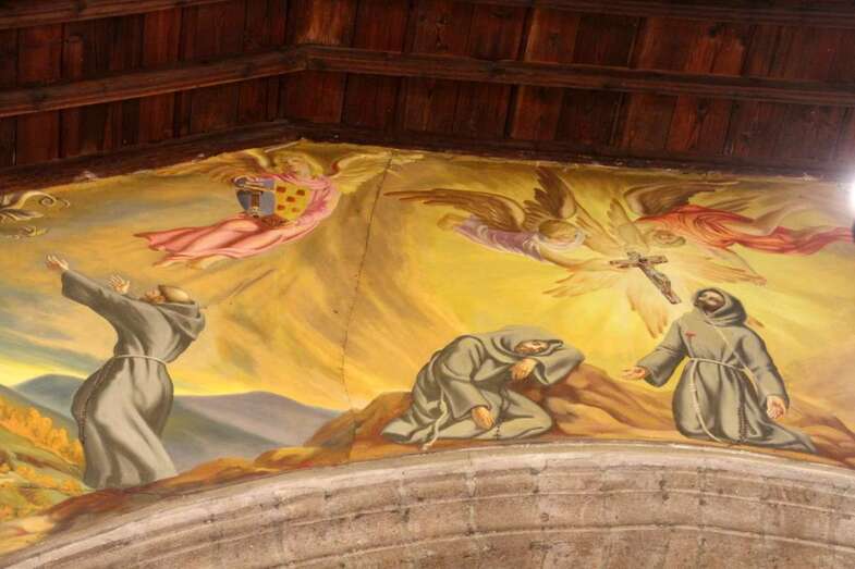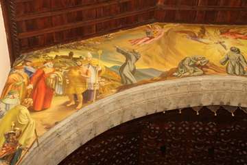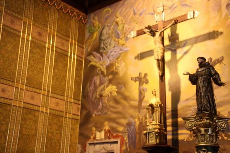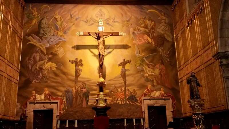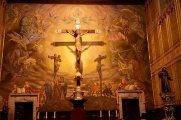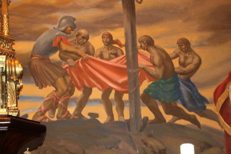 realizada en 1961, sorprende el mural de preciosa expresión e intenso equilibrio cromático, de fuerza y realismo en torno al mensaje de la crucifixión y escenario del Monte Calvario, detalles del grupo de San Juan Evangelista y las Santas Mujeres, el centurión y los soldados romanos repartiéndose la túnica, todo alrededor de la Santa Cruz que en otra dimensión centra la simetría escénica. Complementa este conjunto de pintura sacra la realizada sobre el arco toral de la nave central representando La impresión de las llagas a San Francisco de Asís, obra de 1963 del mismo templo de San Francisco de Asís.