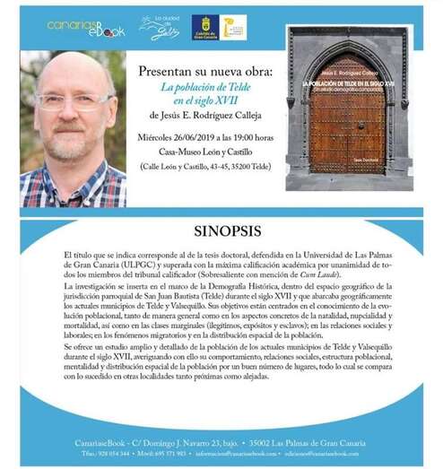 Telde.- El historiador burgalés Jesús Rodríguez Calleja presentó días atrás en la Casa-Museo León y Castillo de Telde su nuevo libro titulado 'La población en Telde en el Siglo XVII', un trabajo que reproduce la tesis doctoral que firmó hace dos años en la Universidad de Las Palmas de Gran Canaria y que ahora edita Canarias eBook.