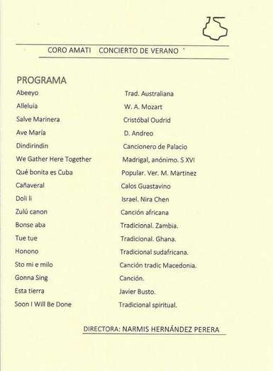 Este Concierto de Verano 2019 de la tarde noche del viernes 26 de julio después de la celebración litúrgica de la misa, despide hasta septiembre la actividad musical, en que se reanuden los ensayos y programas de actuaciones que en su día serán informados, y una vez más con la colaboración y excelente disposición del Párroco de San Juan Bautista de Telde, D. José María Cabrera y personal adscrito, tuvimos la oportunidad de asistir a un variado listado de obras de diferentes estilos, ritmos, cadencias y lírica que desde su inicios arrancaron los aplausos del público asistente con la entrada del coro por el pasillo central interpretando la tradicional australiana Abeeyo: Abeeyo (trad.australiana). Alleluia (W. A. Mozart). Salve Marinera (Cristóbal Oudrid). Ave María (D. Andreo). Dindirindin (Cancionero de Palacio). We gather here together (Madrigal, anónimo S. XVI). Qué bonita es Cuba (Popular. Vers. M. Mártinez). Cañaveral (Carlos Guastavino). Doli li (Israel. Nira Chen). Zúlu canon (Canción africana). Bonse aba (Tradicional Zambia). Tue tue (Tradicional Ghana). Honono (Tradicional sudafricana). Sto mi o milo (Canción Tradicional Macedonia). Gonna Sing (Canción). Esta tierra (Javier Busto). Soon I will be done (Tradicional spiritual).