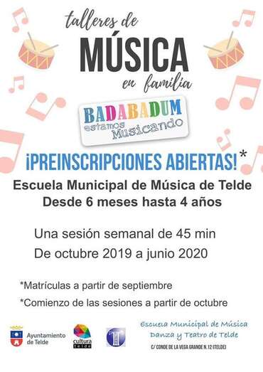 Telde.- La Concejalía de Cultura del Ayuntamiento de Telde abrirá en el mes de septiembre el plazo de inscripción para los talleres de música en familia que imparte la empresa Badabadum en la Escuela Municipal de Música.