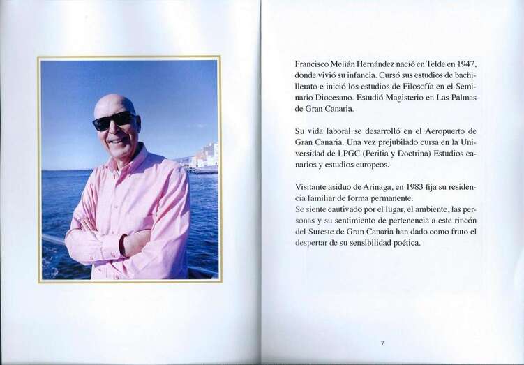 La tarde del miércoles 21 de agosto en un entrañable y, sobre todo, solidario acto, por una causa que justifica su apoyo y voluntaria dedicación personal y colectiva, en la Casa de la Cultura de Arinaga, del término municipal de Agüimes, se dio lectura a poemas incluidos en el poemario Mar y Sueños, obra del escritor y poeta teldense residente en Arinaga desde 1983, Francisco Melián Hernández, obra presentada el pasado 21 de junio en el Salón de Plenos del M. I. Ayuntamiento de Agüimes. El poeta expresa “el sentirse cautivado por el lugar, el ambiente, las personas y su sentimiento de pertenencia a este rincón del sureste de Gran Canaria han dado como fruto el despertar de su sensibilidad poética”.