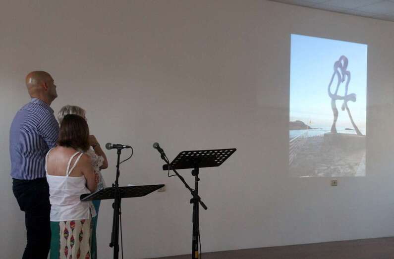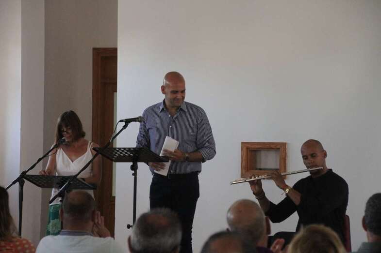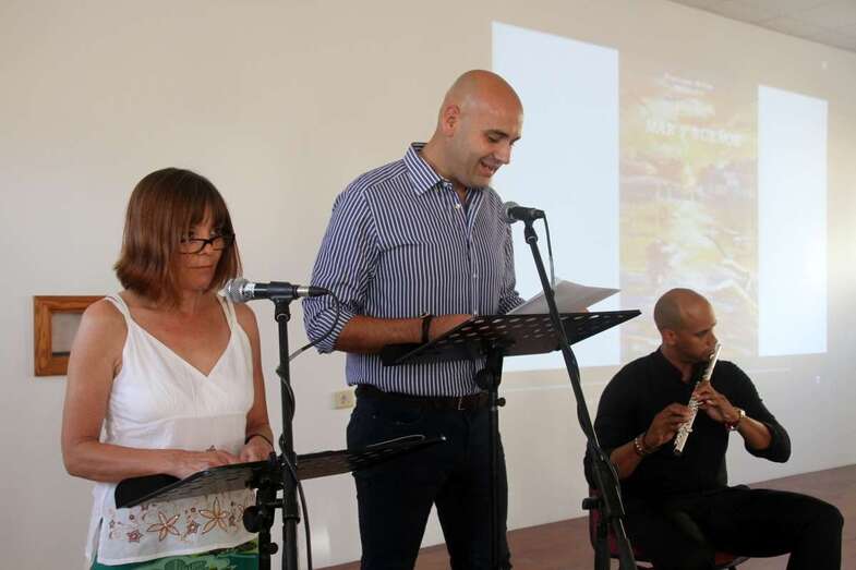El profesional de televisión y radio Sebastián Sánchez Vélez presenta el acto y da inicio a la lectura de poemas acompañado por la colaboradora Olivia Ramírez, que recorren los versos del poema Nace el Alba, Mar y Sueños, que recitan con las notas y dulces acordes de la flauta travesera que interpreta Yasmany Landin.