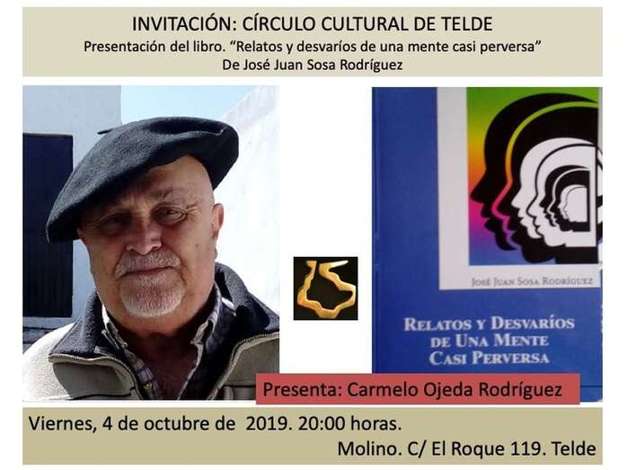 Telde.- La sede del Círculo Cultural de Telde acogerá este viernes, 4 de octubre, la presentación del libro Relatos y desvaríos de una mente casi perversa, la última obra literaria de José Juan Sosa Rodríguez. Será a partir de las 20.00 horas, en inmueble sito en el número 119 de la calle El Roque, en Los Llanos.