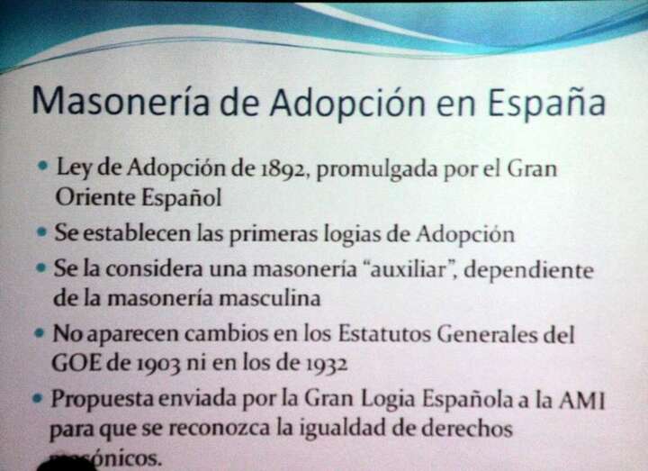 El Gran Oriente Español crea la ley de Adopción en 1892 y se crean las primeras logias de adopción en España. Posteriormente y en varios intentos se reconocerán los derechos masónicos de las mujeres hasta el primer tercio del siglo XX.