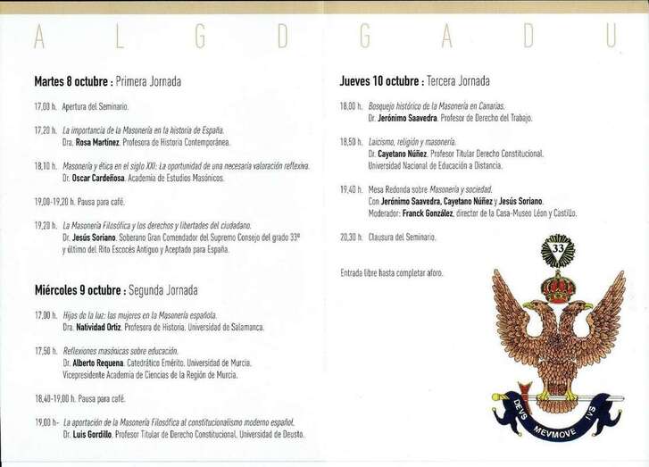 El jueves 10 de octubre en la tercera jornada a partir de las 18:00 horas, se tratarán las ponencias “Bosquejo histórico de la Masonería en Canarias”, a cargo del Dr. Jerónimo Saavedra, Profesor del Derecho del Trabajo. “Laicismo, religión y masonería” impartido por el Dr. Cayetano Núñez, Profesor Titular de Derecho Constitucional de la Universidad Nacional de Educación a Distancia. Tendrá lugar una Mesa Redonda sobre Masonería y Sociedad, con la intervención de D. Jerónimo Saavedra, D. Cayetano Núñez y D. Jesús Soriano, actuando de Moderador, Frank González, director de la Casa Museo León y Castillo. Con estas ponencias y mesa redonda se clausura el Seminario.