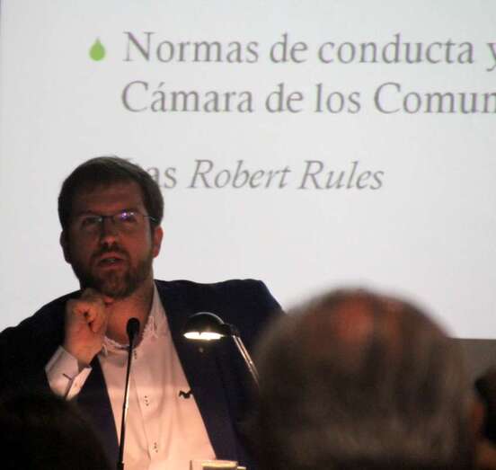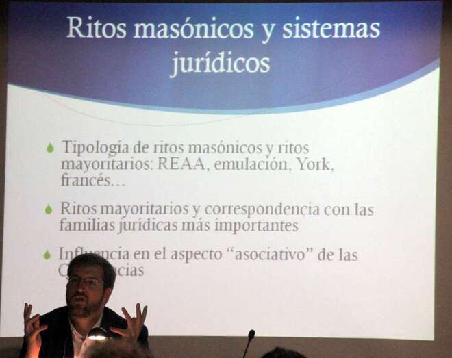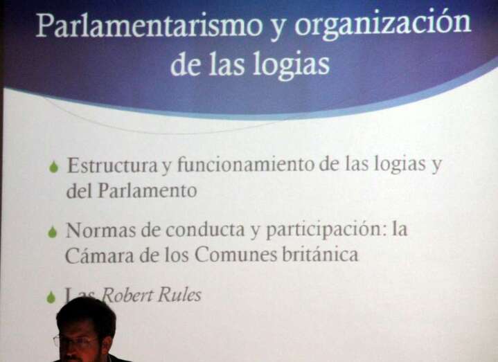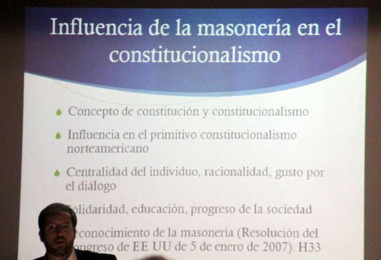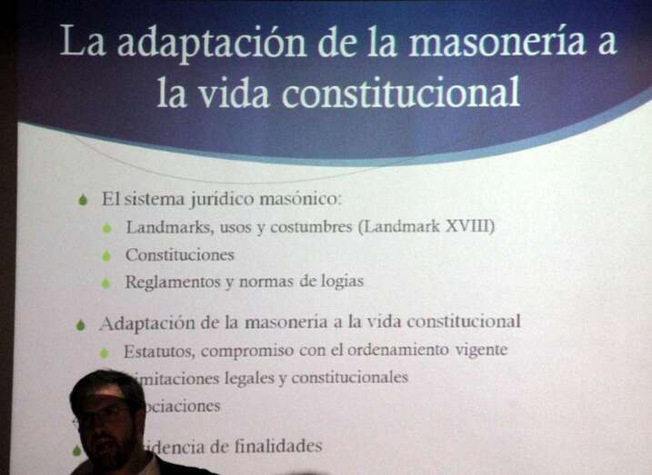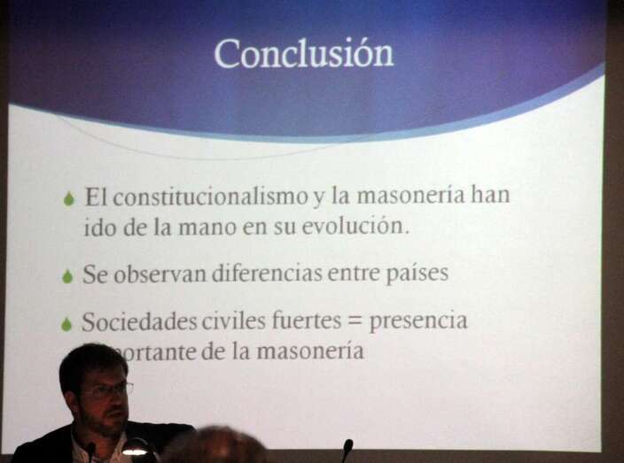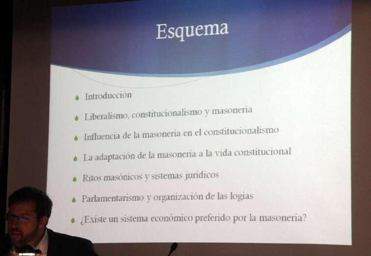 a tercera ponencia de la jornada a cargo del Dr. Luis Gordillo, profesor titular de Derecho Constitucional en la Universidad de Deusto, imparte la ponencia “La aportación de la Masonería Filosófica al Constitucionalismo Español”, desarrolla los conceptos de liberalismo y cómo la propia masonería a través de sus obediencias se adapta a la propia vida constitucional. Existen distintos ritos entre la masonería filosófica y la simbólica, con las aportaciones recíprocas de la vida parlamentaria de los órganos colectivos, órganos colegiados de decisión que son comunes en las grandes logias y el propio parlamento. Y el tema económico implantado de manera desigual como en España durante la dictadura.