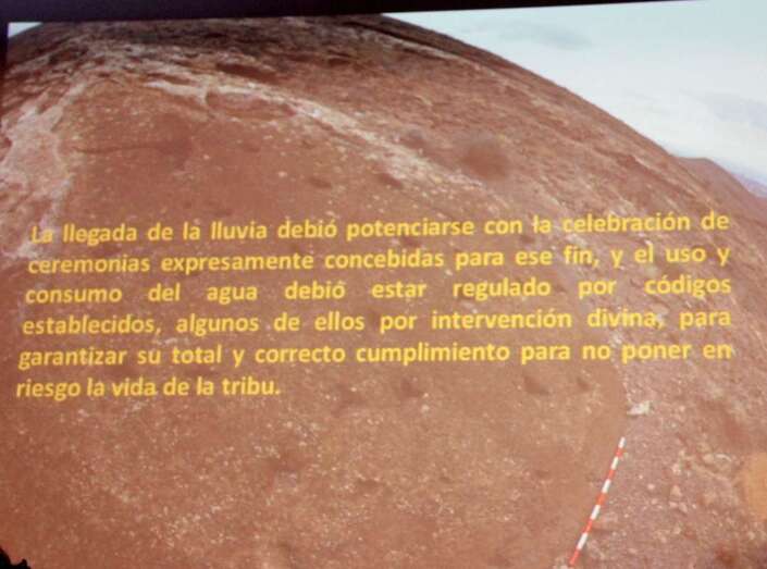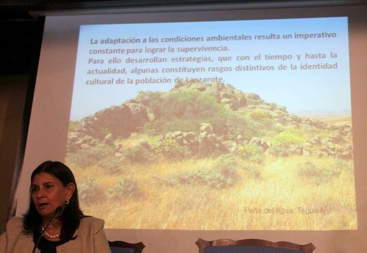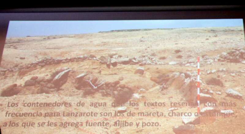 La doctora María Antonia Perera Betancor finaliza su amplia ponencia realizando un verdadero viaje antropológico y de asentamientos de la población aborigen en Lanzarote con acercamiento en menciones a Fuerteventura, en sus localizaciones y toponimias, tras el rastro de las lluvias y las formas aborígenes de almacenar, controlar y usar el agua que del cielo, origen de una fe en la gracia divina de la creencia religiosa de atraer el agua y sacralizar sus efectos tan necesarios para la vida y subsistencia de los aborígenes canarios.