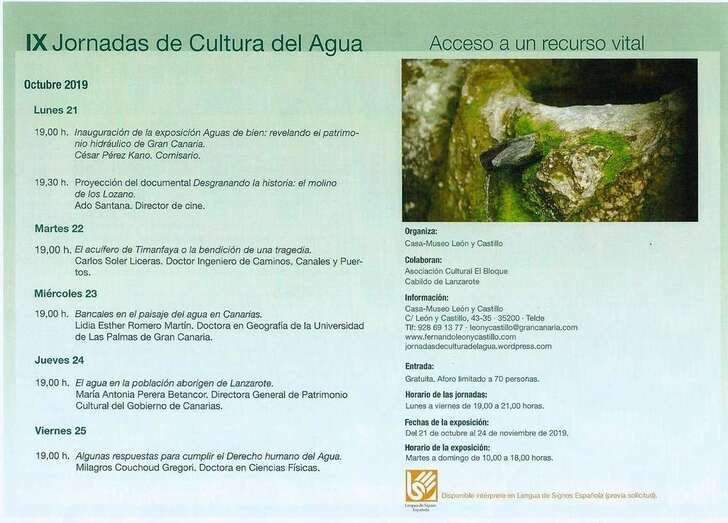 Las IX Jornadas de Cultura del Agua que con el lema Acceso a un recurso vital llegan al cuarto día de ponencias que el jueves 24 de octubre con la conferencia “El agua en la población aborigen de Lanzarote” imparte la Dra. María Antonia Perera Betancor, Directora General de Patrimonio Cultural del Gobierno de Canarias. Ciclo de Cultura del Agua que en esta su novena edición viene celebrando desde el lunes 21 al viernes 25 de octubre en la Casa Museo León y Castillo de Telde, institución museística dependiente de la Consejería de Cultura y Red de Casas Museo del Cabildo de Gran Canaria, en esta su novena edición.