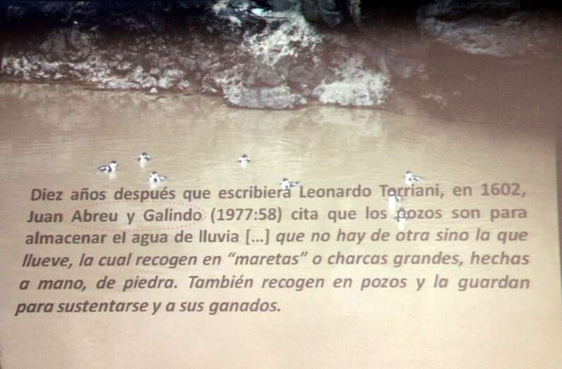 Es decir, habla de un agua buena, ligera, para beber, que son las de las maretas, aljibes o cisternas, y un agua pesada dura que está en los pozos. Los vocablos que más refieren los textos de la antigüedad son, maretas, charcos, estanques, y luego se agregan las fuentes, aljibes y pozos. Y posiblemente sean tres vocablos, cisternas, charcos y maretas que designan el mismo vaso. Se utilizan dos vocablos para designar un mismo elemento y no queda claro que características deben tener uno y otro. Posiblemente los charcos de las fuentes escritas sean las maretas. Tanto los aljibes como las maretas se construyen allí donde hay un corto recorrido de agua. Toda la zona al norte del Mirador del Río, y al sur hasta el pueblo de Ye, hay numerosas maretas que ahora aparecen y están ahí por ser una zona de lluvias.