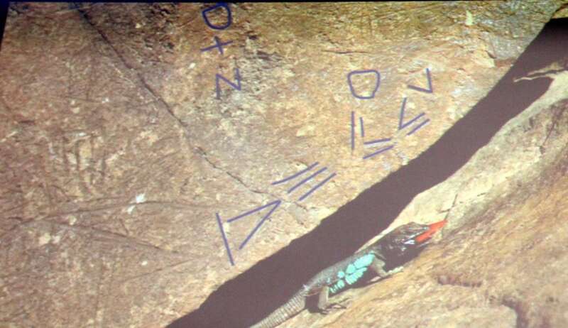 En estos lugares es donde también se escribe, hemos dicho que la misma población de Lanzarote y Fuerteventura responden a la misma tribu, escriben líbico bereber igual que la totalidad menos La Graciosa de la población canaria, pero, además, la población de Lanzarote y Fuerteventura utilizan otro alfabeto que hemos llamado líbico canario, líbico bereber, aunque ahora estamos discutiendo si le ponemos otro nombre. Hay aborígenes que escriben en las piedras la misma palabra en líbico bereber y líbico latino. Hasta ahora no sabíamos que valor tenían determinados signos líbicos, pero esta escritura de inspiración es vocálica, se escriben vocales y consonantes, sin embargo, la líbica bereber solo las consonantes.