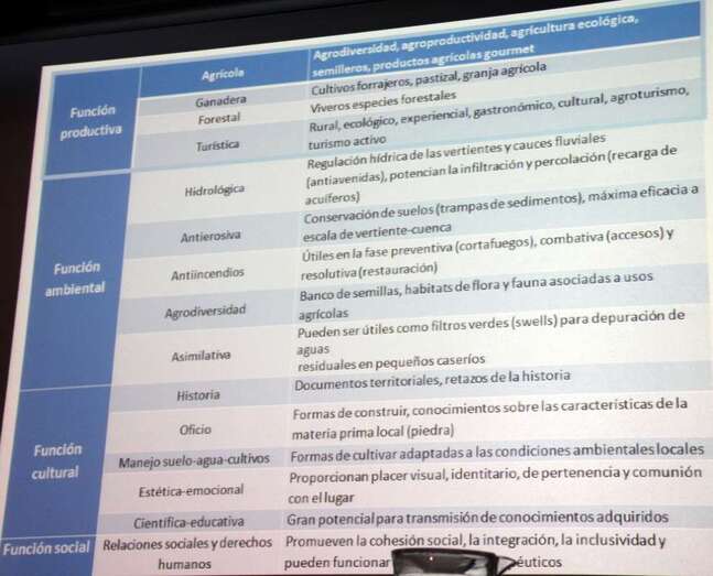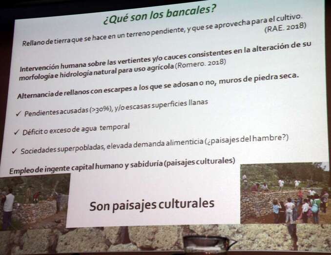 El miércoles 23, Lidia Esther Romero Martín, doctora en Geografía por la Universidad de Las Palmas de Gran Canaria, imparte la ponencia: Bancales en el paisaje del agua en Canarias. La doctora Romero Martín expone en su intervención un amplio y bien documentado signo característico de nuestros paisajes insulares que se involucran en la diversidad paisajística, señal identitaria de una cultura agraria, que va más allá del simple efecto visual, paisajístico y humano que a través de la historia de nuestros campos la mano humana ha logrado dominar y aprovechar, con gran esfuerzo y laboriosidad, los efectos positivos de los bancales que sujetan y soportan los conocidos muros de piedra seca, usos, maneras y costumbres de trabajar la tierra y el agua para adecuarla para los propósitos agrarios en todo el mundo.