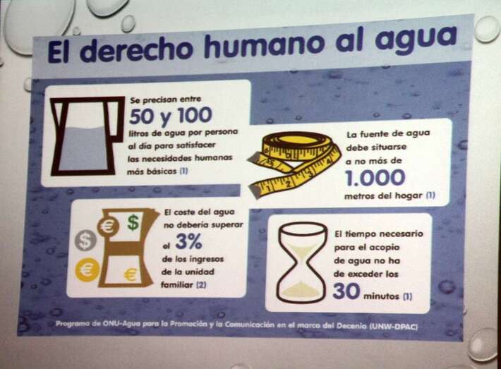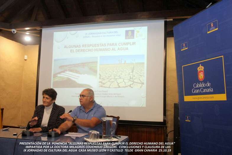 El viernes 25 culminan la serie de ponencias con la intervención de una autoridad nacional e internacional en el mundo del agua, la doctora en Ciencias Físicas, presidenta del Instituto Mediterráneo del Agua, Milagros Couchoud Gregori que imparte la ponencia Algunas respuestas para cumplir el Derecho Humano del Agua. Expone la búsqueda de las respuestas y aplicación de los derechos que la población mundial tiene al uso de las aguas, respuesta que podemos dar a ese derecho humano al agua que antiguamente era algo que la gente entendía muy bien y que a lo largo de los siglos se fue perdiendo, la credibilidad en ese derecho, y muchas instituciones han trabajado duramente para poder llegar a que en el año 2010, Naciones Unidas en su Asamblea General, el 28 de julo de 2010, tomara la resolución de reconocer el Derecho Humano al Agua y al Saneamiento como un derecho como puede ser la vida, la alimentación, y otros tantos derechos. Puesto que el agua se ha considerado como la base de la vida, sin agua no hay vida, no hay desarrollo, por lo cual, que tenga el ser humano derecho a esa agua es algo que debe parecernos absolutamente lógico.