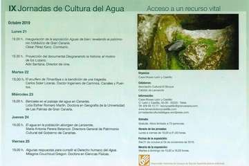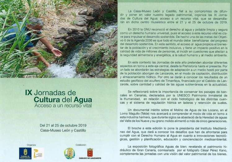 Con la última ponencia impartida la tarde del viernes 25 de octubre se clausuraron las IX Jornadas de Cultura del Agua que se han venido celebrando desde el lunes 21 en la Casa Museo León y Castillo de Telde, institución museística dependiente de la Consejería de Cultura y Red de Casas Museo del Cabildo de Gran Canaria. Con un programa de actos y ponencias centradas en el mundo del agua y su cultura en Canarias, bajo el lema Acceso a un recurso vital, se han diversificado las conferencias con una detallada y documentada exposición resultado de estudios e investigaciones que los especialistas y profesionales de cada materia impartida, historia, arqueología, tecnología, geoarqueología, paisajes, población aborigen, etnografía, patrimonio hidráulico, centros de usos hidráulicos y el futuro del agua en los proyectos, la relación energía-agua, y la necesidad de aplicar el derecho humano al agua en todos los lugares del mundo, especialmente los países más acuciados por las sequías, pobreza, miseria y el actual momento de la situación del planeta ante el cambio climático.
