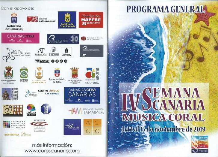 Enhorabuena por la excelente elección de la organización de la IV Semana Canaria de Música Coral, en la que voz y arte se aúnan para elevar el espíritu y disfrutar del contenido interior y el continente que abriga, orna y embellece aún más el mensaje de la palabra y voz cantada. Un amplio y diverso programa de actuaciones repartidas por varias localidades insulares con un excelente repertorio de composiciones y arreglos para Grupos corales que hacen las delicias de un público aficionado y el estímulo de las formaciones de coros para seguir en el estudio, la práctica y el reto de conseguir nuevas adaptaciones para grupos corales.