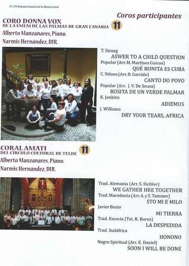 El Coro Amati del Círculo Cultural de Telde, bajo la dirección de la profesora Narmis Hernández Perera, y al piano Christian Díaz, interpretando los temas: We gather hiere together (tradicional Alemanaia Arr. S. Deibler). Sto Mi e Milo (tradicional Macedonia. Arr. A. y Z. Zammer). Mi Tierra (Javier Busto). La Despedida (tradicional Escocia. Txt. R. Burns). Honono (tradicional Sudafricana). Soon I Will be done. (Spiritual Arr. E. Daniel).