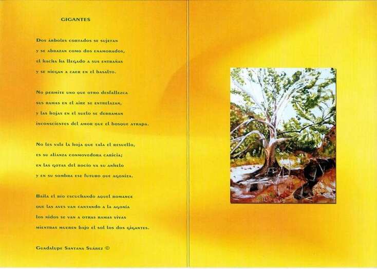 Gigantes: Dos árboles cortados se sujetan/ y se abrazan como dos enamorados,/ el hacha ha llegado a sus entrañas/ y se niegan a caer en el basalto./ No permite uno que otro desfallezca/ sus ramas en el aire se entrelazan,/ y las hojas en el suelo se derraman/ inconscientes del amor que el bosque atrapa./. No les vale la hoja que tala el resuello,/ es su alianza conmovedora caricia;/ en las gotas del rocío va su anhelo/ y en su sombra ese futuro que agoniza./ Baila el río escuchando aquel romance/que las aves van cantando a la agonía/ los nidos se van a otras ramas vivas/ mientras mueren bajo el sol los dos gigantes./