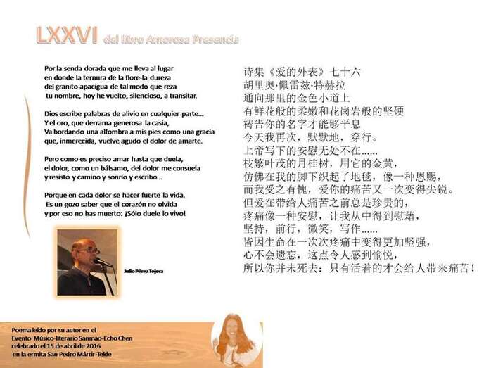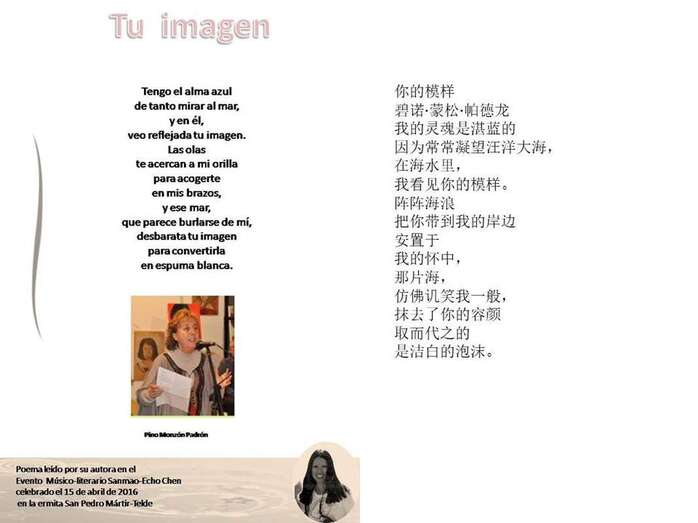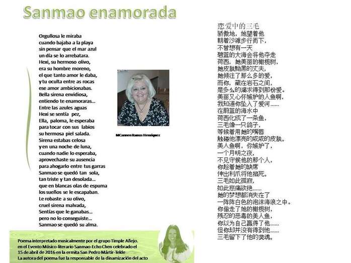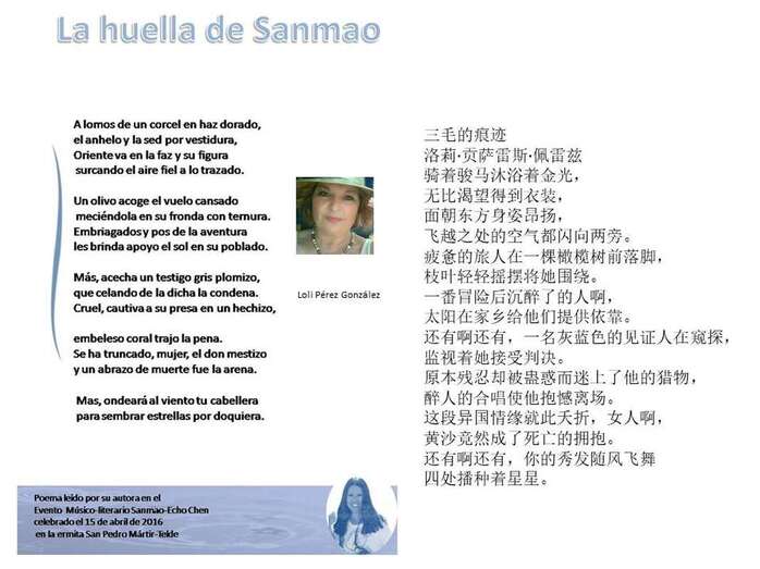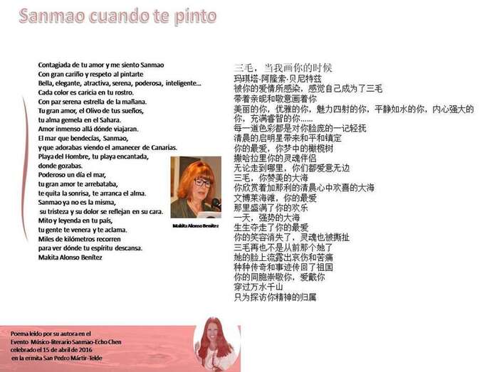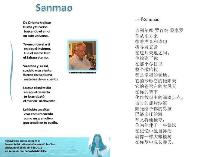Pino Monzón Padrón, Julio Pérez Tejera, Makita Alonso Benítez, Guillermo Robaina Monteiro, Loli Pérez González y Maricarmen Ramos Henríquez son los escritores seleccionados y sus poemas fueron recitados en el primer evento dedicado a Sanmao en abril de 2016 en la Iglesia Hospitalaria de San Pedro Mártir de Verona, traducidos posteriormente a chino con la colaboración del Instituto Confucio de la ULPGC.